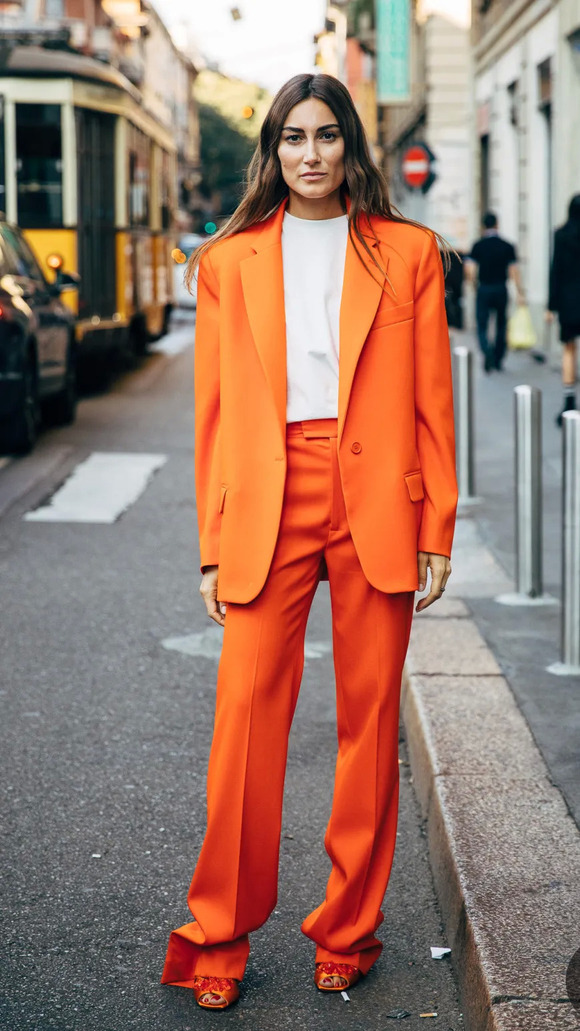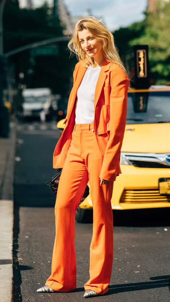 胆大肤色正的妹子还可以pick一些饱和度高的明媚色。尤其是橘色和苹果绿,都挺适合亚洲妹子。至于搭配小tips?那就是搭配黑白基础色咯,时装精们都给出了完美示范~