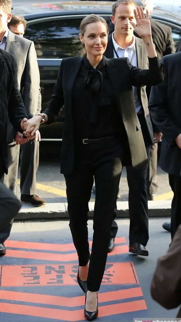 朱莉也是饼心中关于西装套装的最佳人选之一,她的从容大气太适合这个穿法了。朱莉偏爱的是干脆利落的黑和白,这种冷淡对比色好适合她!