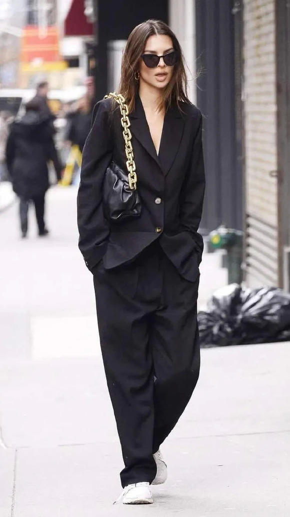 前不久话题超模Emily Ratajkowski就受Bianca的影响,穿着一身200美元的Zara吸烟装,把自己嫁了。