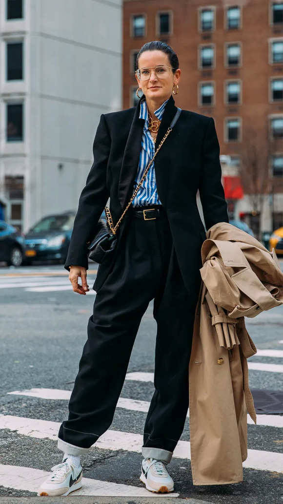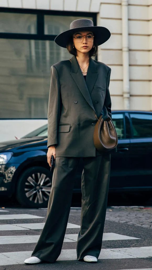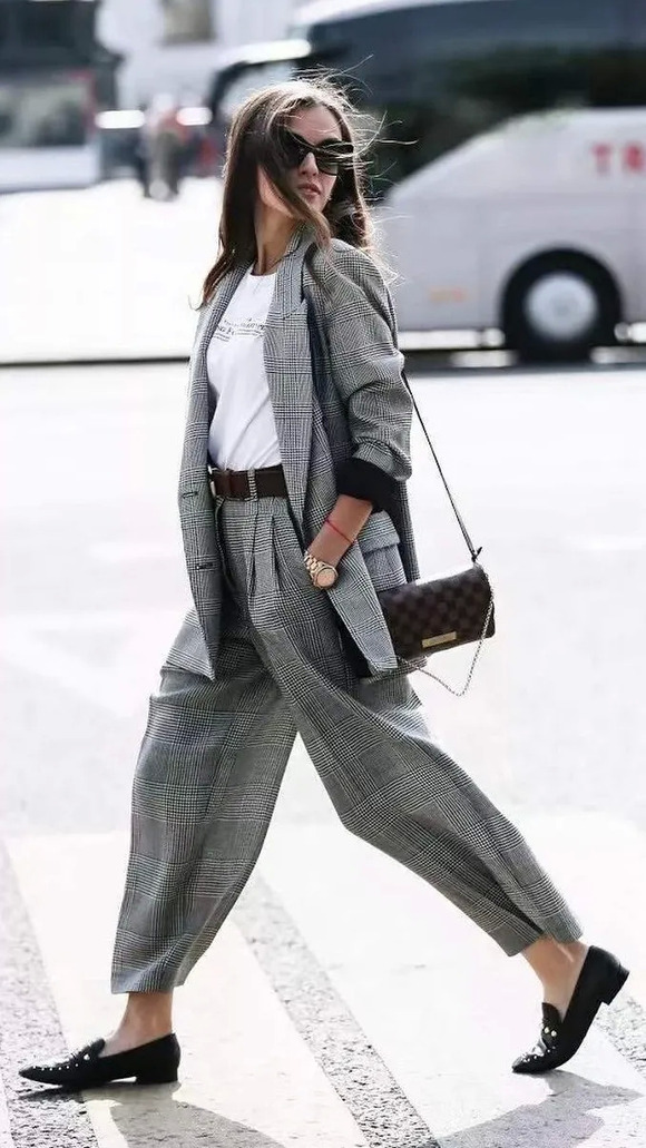 想要跟前面我们提过的街头感oversize穿出差别?避开厚底鞋就行!薄薄的鞋底,无论是平底还是高跟,盖上阔腿裤脚口,都可以穿出女boss的感觉!
