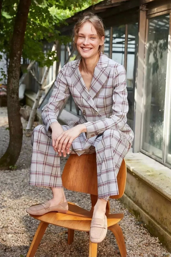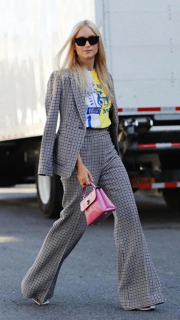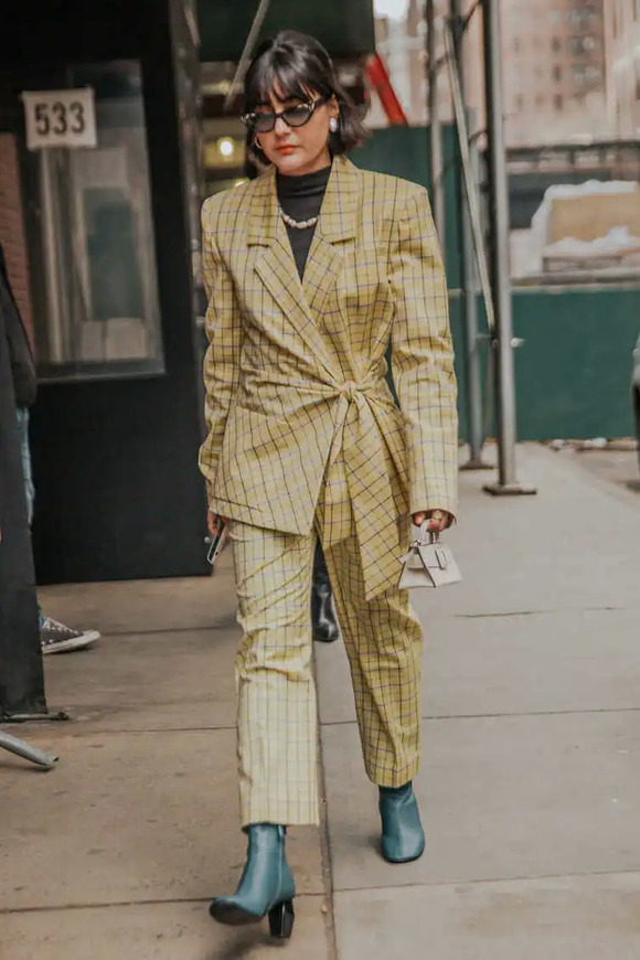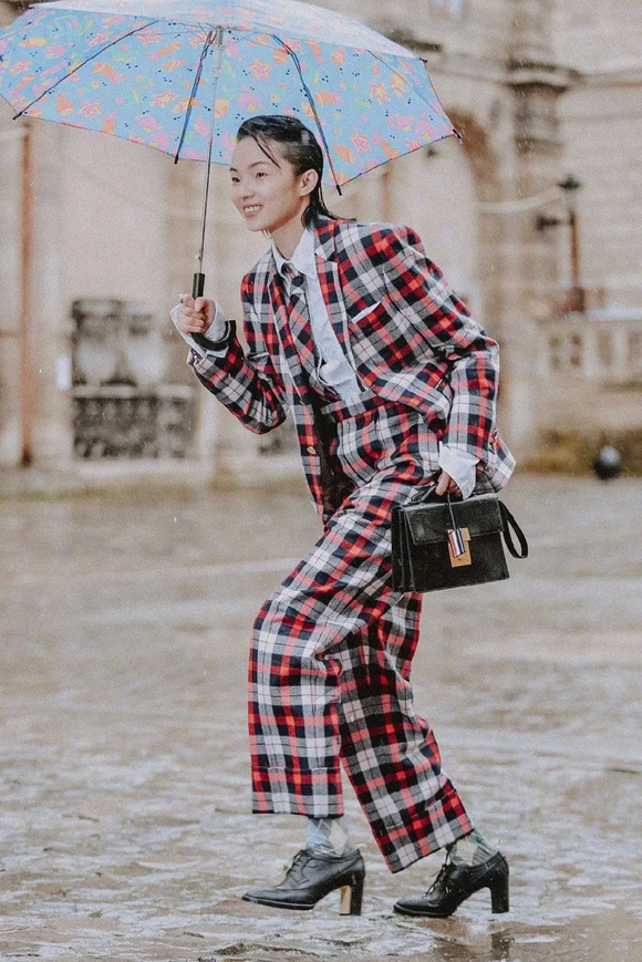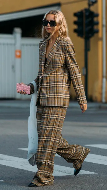 除了纯色套装,你还可以pick格纹。不是秋冬爱穿的那种细腻格纹肌理,而是对比度更鲜明的亮色格纹,这能让你看起来活泼又春天~