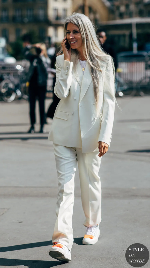 自带休闲感的白T,可以轻松化解西装的严肃,而且还减龄。同时这一搭也不会显得过于随便,完全可以兼顾休闲场合和办公室。