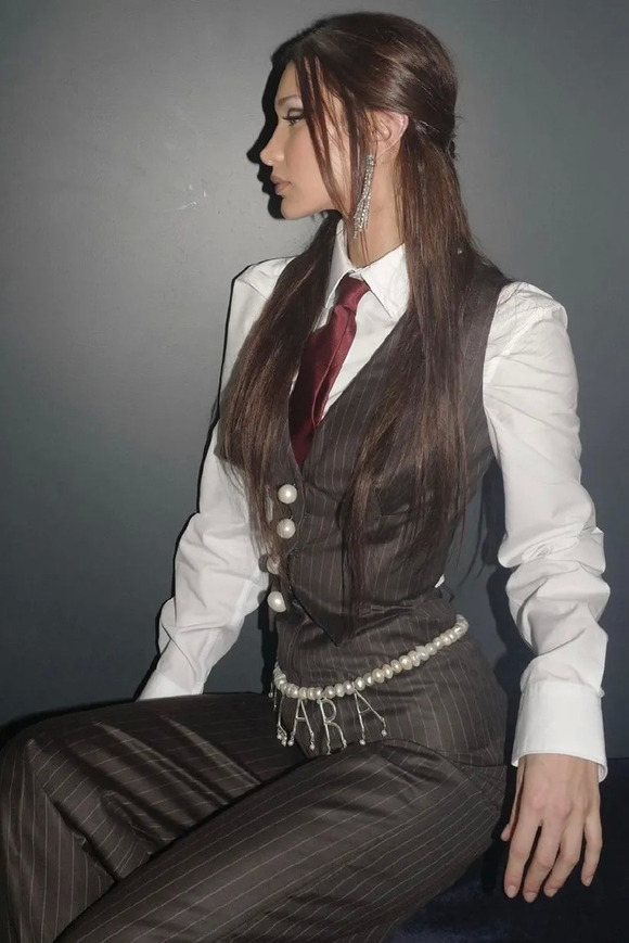 Bianca私下完全就是套装大户。她穿过完整的three pieces(西装+马甲+西裤),也穿过性感的裹胸内搭。