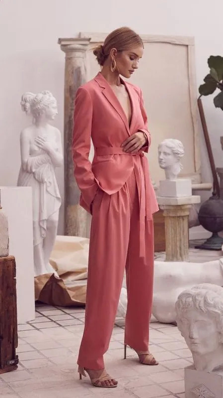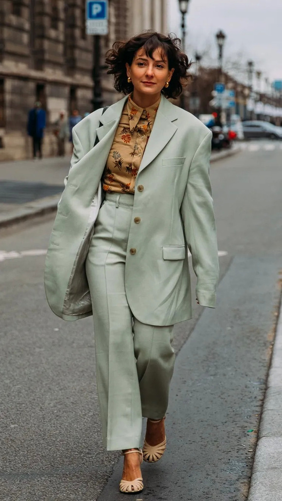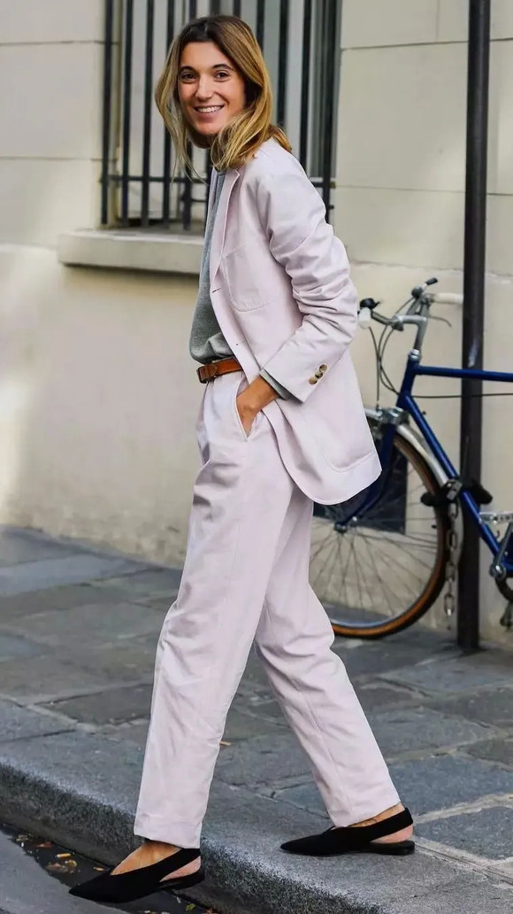 从选品上来说,缎面材质也能让你的西装套装看着柔和不少。还有能凸显腰身的收腰版型,加个腰带的话会让女性特征更为突出。