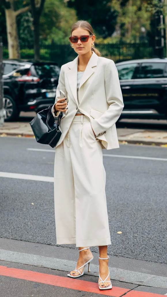 要论清爽,怕是没什么能拼的过白色。尤其是没有束缚感的阔腿裤套装,看起来整个人都充满活力!再拎上一枚莫兰迪色的包,减龄10岁不是事儿!