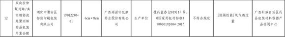 业绩低迷的同时,此前又被药监局点名。据了解,在广西两面针亿康药业股份有限公司抽样的、潮安市潮安区标致印刷包装有限公司生产的双向拉伸聚丙烯/真空镀铝流延聚丙烯药品包装用复合膜,经广西壮族自治区药品包装材料容器产品检测中心检测,[阻隔性能]氧气透过量不符合规定。