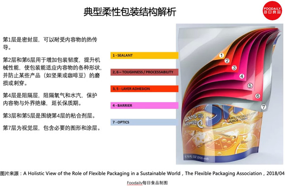 典型的柔性包装由密封层、机械层、阻隔层、粘合剂层和视觉层构成,最多可达11层。