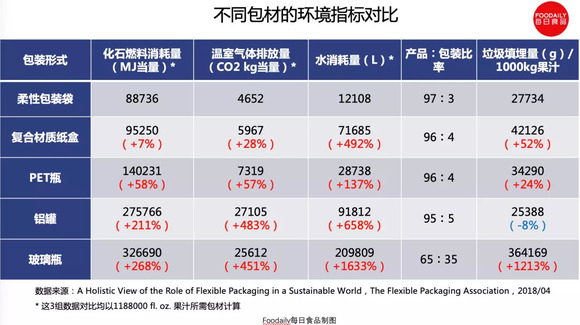 对于最为消费者所看重的环保性能,我们用一组数据来直观说明。在一般人的眼中,纸盒已经属于环境友好型包材,而柔性包装袋与复合型纸盒作对比,无论是燃料消耗、温室气体排放、水的消耗量,还是产品与包装比率、垃圾填埋量,柔性包装都明显占优。