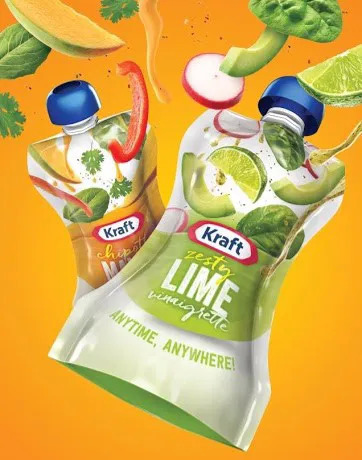 2016年初,卡夫亨氏推出Anytime! Anywhere! 系列立式包装沙拉酱。3.2盎司的软袋具有瓶装沙拉酱一样的沙漏形状,具有很好的持握手感,申请专利的四层箔基材质提供了严密保护,与灌装设备无缝兼容。新产品的核心理念被定义为“让沙拉贴近生活”。包装袋周身上下翻飞的新鲜食材充满动感活力。在使用过程中,消费者能真切体会到“轻轻一握、精准控制”的贴心和成就感。
