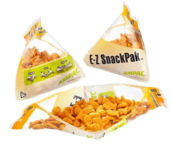 E-Z SnackPak是ProAmpac开发的另一个创新包装,一款四角包,撕开后可以变成一个托盘,既增大了容量,又更便于抓取。与同等容量的其他包装相比,E-Z SnackPak的包材用量减少了25%。该产品荣获2016年世界之星包装创新大奖(WorldStar Awards)。