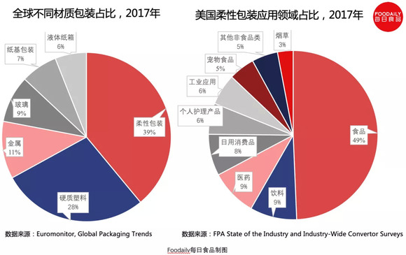 美国柔性包装协会(Flexible Packaging Association,FPA)在2018年指出,柔性包装在2017年占全部包装市场份额的39%,远高于硬塑料、金属和玻璃,其总产值约为860亿美元。