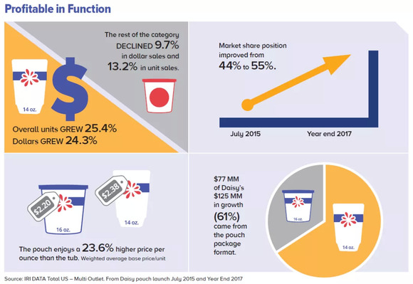 早在2015年,这种STANDCAP倒立式包装就应用在Daisy Sour Cream中,在2年多的时间里,帮助这款产品的销售额提升24.3%(同品类其他品牌产品同比下降9.7%),市场占有率从44%升至55%。可以说为Daisy立下了汗马功劳!也因此引发全行业的广泛关注。