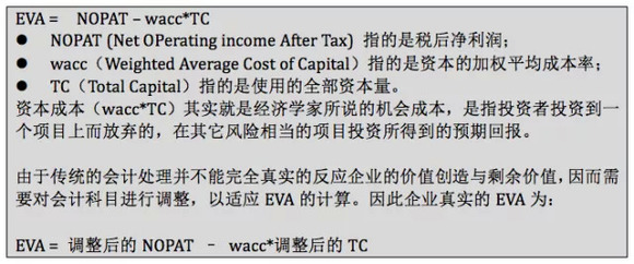 EVA(Economic Value Added)即经济增加值,是由美国思腾思特管理咨询公司(Stern Stewart Consulting Co.Ltd)在上世纪80年代提出的。其基本概念是投资回报超过资本成本的那部分剩余收益,才是企业经营所创造的收益。公式如下图。