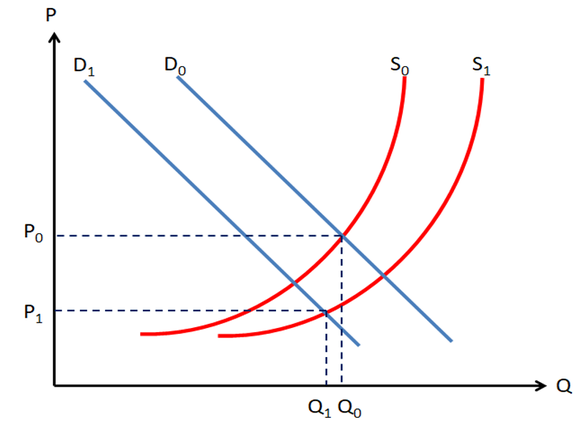 各国为抗疫,大都实行了居家隔离、封村、封城、封国等措施。这造成公路交通受限、航空跳水式下降、旅游业归零、制造业停业停岗,对石油的需求急剧下降。需求曲线快速左移(D0→D1)。
