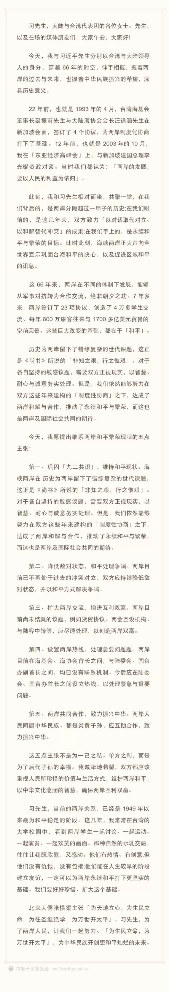 尊敬的马英九先生,今天是一个非常特别的日子,两岸领导人见面,翻开了两岸关系历史性的一刻,历史将会记录今天,曾几何时,台海同胞隔海相望,亲人音讯断绝,无数家庭,留下了刻骨铭心的伤痛,甚至是无法弥补的遗憾。然而两岸兄弟亲情,挡不住同胞对故土的思念,以及家庭的渴望、同胞亲情的渴望,终于在上个世纪80年代,两岸走上了和平发展的道路。