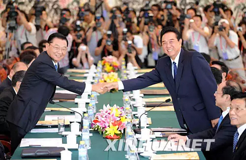 ▲2008年4月,胡锦涛在海南博鳌会见两岸共同市场基金会董事长萧万长。萧万长是赢得胜选的台湾地区领导人马英九的副手,即台湾地区副领导人。“胡萧会”被认为是1949年以来海峡两岸最高层的直接会谈,同时也预示着台海回暖。