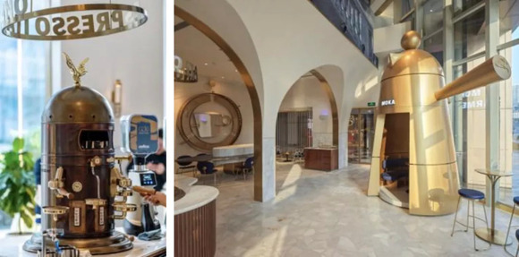 Lavazza上海旗舰店。古董咖啡机(左)和Lavazza Carmencita摩卡壶装置(右)