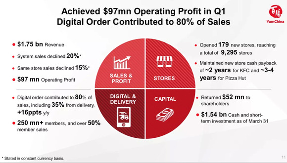 分品牌看,肯德基一季度同店销售额下降11%;必胜客因其业务模式主要为休闲餐厅和家庭聚餐场景,受疫情的不利影响更大,一季度同店销售额下降31%。