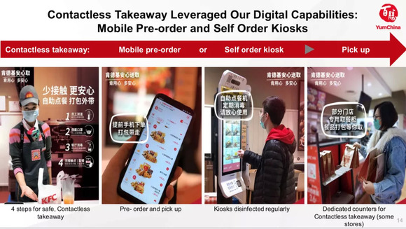 财报显示,数字化订单(含外送、手机点餐、点餐机点餐)贡献了该公司销售额的80%,其中肯德基与必胜客的数字化订单分别占销售的84%和65%。由于消费者越来越多选用外带服务,手机自助点餐增长迅速。