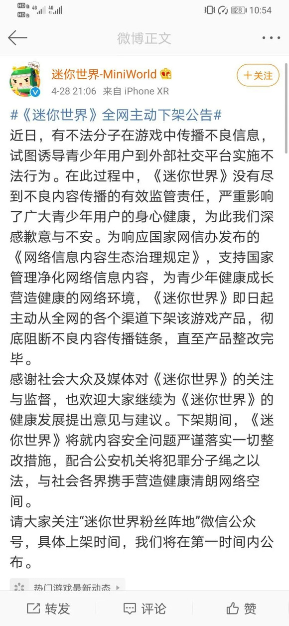 4月7日,《迷你世界》游戏官方发文表示将进行整改,与此同时,大量微博用户用带有#迷你世界涉黄#的话题发博,呼吁网友劝告身边未成年玩家远离游戏,要求运营商下架。