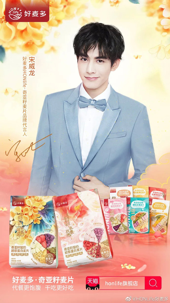 4月26日,好麦多HONlife官宣宋威龙成为奇亚籽麦片品牌代言人。