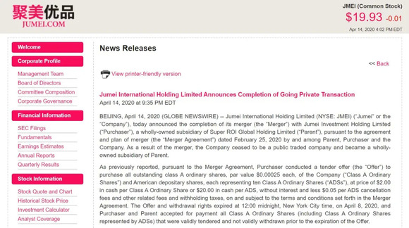 4月15日,聚美优品宣布完成私有化,而后4月27日向美国证券交易委员会提交文件,正式从纽交所退市,退市时市值约为2.28亿美元。