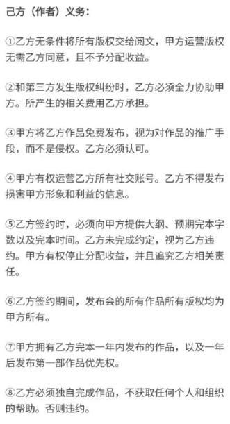 根据网上流传的截图显示,"乙方(作者)无条件将所有版权交给阅文,甲方运营版权无需乙方同意,且不予分配利益"、"和第三方发生版权纠纷时,所产生的相关费用由乙方承担"、"甲方将乙方作品免费发布,视为对作品的推广手段,而不是侵权,乙方必须认可"等。