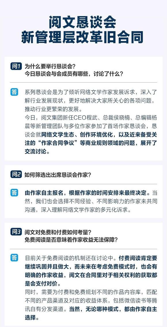 针对评价和反馈最多的新合同,阅文新任管理团队在恳谈会上表示,不存在所谓的新合同,这是多年来的历史遗留问题,也是一个商业规则的问题。网络不少传言将其误读为管理层实施的新政。针对过去多年来合同中遗留下来的不合理之处,应该也必须修改,对于作家应有的权利应该明确在条款里。希望结合作家恳谈和调研的意见修改优化,并在1个月内推出新版合同。