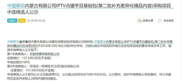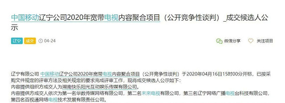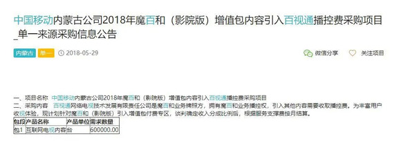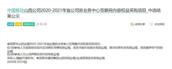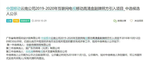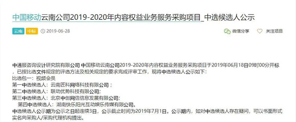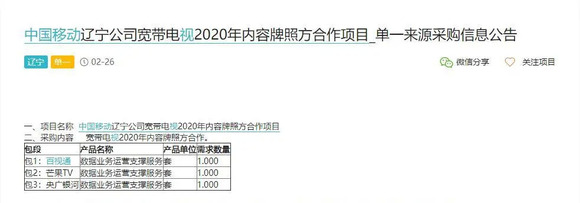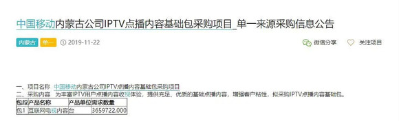 近期,在公开的招标网上,出现大量各省中国移动宽带电视IPTV的招标公告,多以采购电视内容、电视增值业务、优化电视运营平台为主,相关信息陆续被披露,其中值得注意的是,中国移动各省IPTV合作中,内容采购源多会以OTT服务的牌照商为主,择其为内容聚合的合作对象,这意味着中国移动在IPTV的内容合作商,不仅关注于内容聚合本身,OTT集成播控平台的牌照,同时也是合作中重要的筹码。