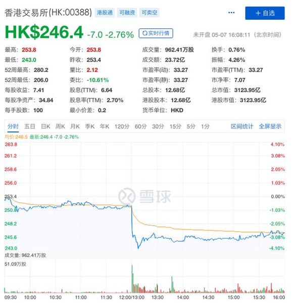 5月7日午后开盘,港交所股票瞬间出现跳水,跌幅一度扩大至4%。