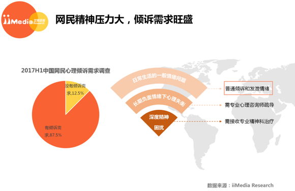 在艾媒网2017年的调查数据显示,普通大众中,精神压力巨大,有心理倾诉需求的网民占比高达87.5%,而领域的需求如此强劲旺盛,也让很多企业与资本方跃跃欲试。