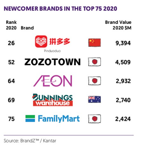 3)五个新入榜品牌:依托在线团购模式高速成长的中国电商平台拼多多(第26名,94亿美元),日本潮流服饰电商平台 Zozotown(第52名,45亿美元),日本百货零售商 Aeon永旺(第64名,29亿美元),日本连锁便利店全家 FamilyMart(第75名,24亿美元),澳大利亚的五金连锁超市 Bunnings(第69名,27亿美元)。