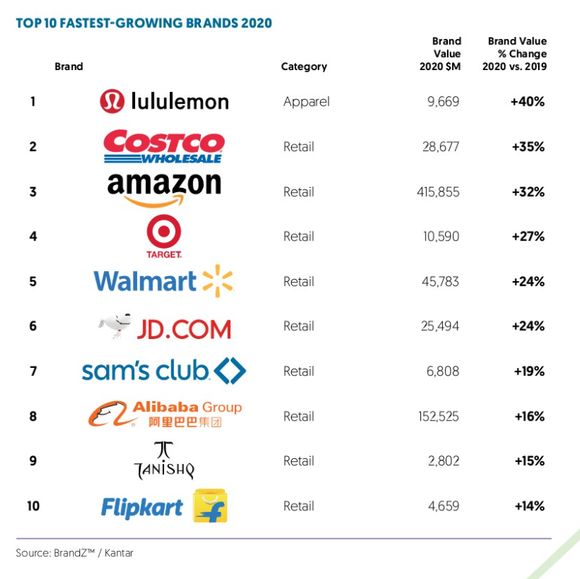 阿里巴巴、京东、拼多多和苏宁易购等四个中国零售品牌上榜。值得一提的是,服装类 Lululemon (露露乐檬)以40%的品牌价值增速高居年度零售品牌价值增速榜首位。