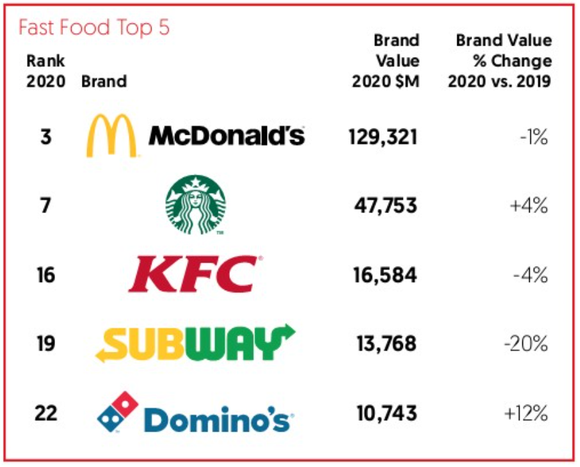 快餐类品牌价值排名前五的品牌依次是:McDonald’s(麦当劳)、Starbucks (星巴克)、KFC (肯德基)、SUBWAY (赛百味)、Domino’s (达美乐)。