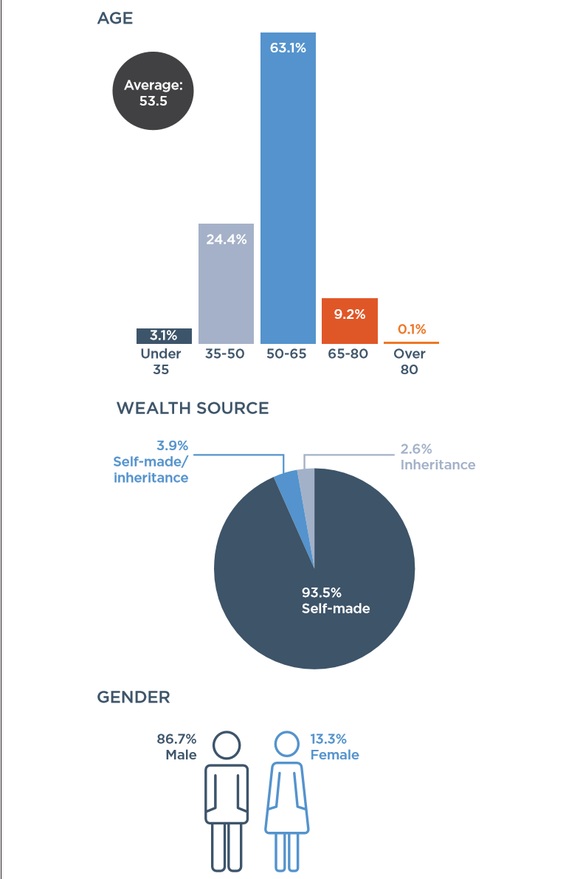 他们中 93.5%是白手起家,只有2.6%是继承财富。