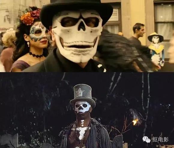 在《幽灵党》两分半钟的预告片中充斥着大量的致敬细节。亡灵节面具致敬《007生死关头》中的神秘角色萨米迪男爵。当年扮演萨米的男爵的乔弗里·霍尔德于去年10月去世,享年84岁。