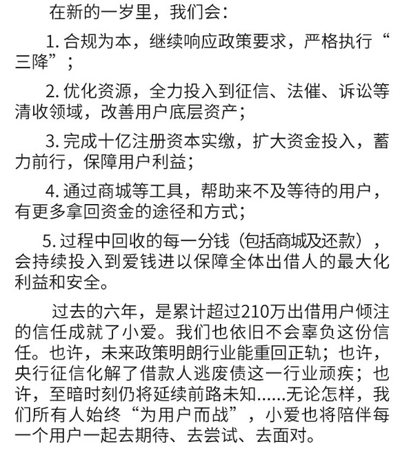 5月6日,爱钱进论坛的小爱解惑向投资人证实内部信的真实性,并贴出具体内容。其中,爱钱进联合创始人、CEO杨帆承诺,新的一岁里,公司会合规为本、优化资源、完成十亿注册资本实缴……