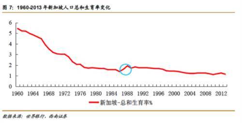西南证券分析师对日本、新加坡两国鼓励生育政策对生育率的影响进行了横向比较,并展示了这种“低生育率”现象在东亚地区的普遍性。西南证券认为,根据日本经验,自80年代初鼓励生育政策推行后,日本人口生育率在1981-1984 年间曾有一个短暂回升,但此后一路下滑,2003 年左右已经到了1.3 以下。类似情况也在新加坡发生。