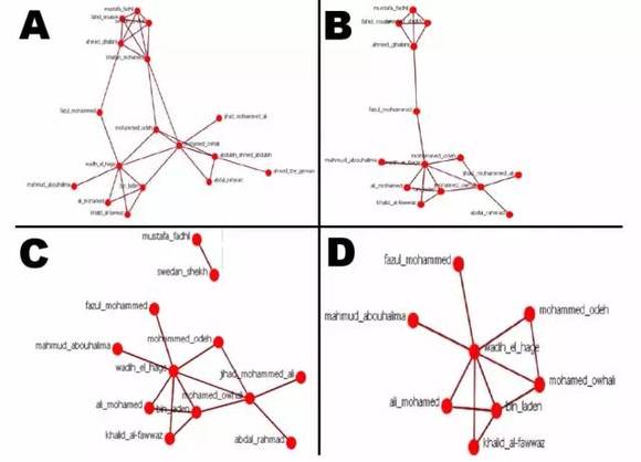 上图是他们的一个例子:坦桑尼亚网络的节点被贪婪启发式搜索去除后的可视化表现。图A是初始网络,图B去除了3个节点,图C去除了5个节点,图D去除了9个节点。随着去除的节点越来越多,图形变得越来越像星形。当去除11个节点后,拓扑结构就完全像一个星形了。