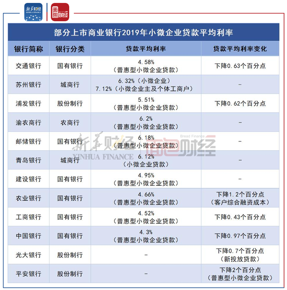 根据披露信息,2019年,交通银行、建设银行、农业银行、工商银行和中国银行普惠型小微贷款的平均利率在4%~5%之间,在同业中属于较低水平。