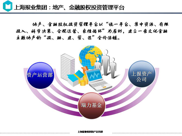 地产、金融股权投资管理平台由集团资产运营部、上报资产公司和瑞力基金组成,以“统一平台、集中资源、有限投入、科学决策、合规运营、良性循环”为原则,建立一条文化金融主题地产的“投、融、建、管、退”全价值链。