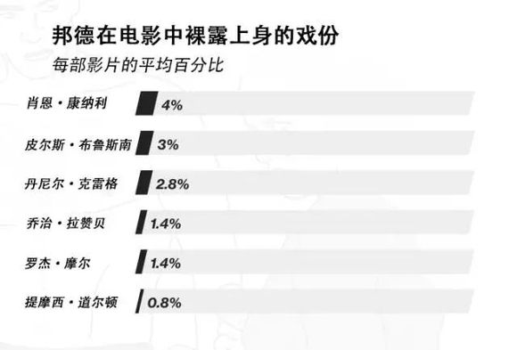 在 24部 007系列电影中,邦德在 21部 影片中有裸露上身的戏份。作为业余健美运动员,康纳利是裸露上身时间最长,在每部电影中的裸露戏份也最多的演员。在电影《霹雳弹》中,康纳利 超过9% 的时间都在镜头前赤裸上身,包括大量游泳和按摩的镜头。