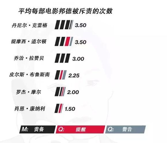 管理詹姆斯·邦德可不是件容易事。他总是粗暴无礼,偶尔不服从命令,经常搞出风流韵事。他的上司M训斥起他来丝毫不留情面。克雷格饰演的邦德被M斥责的次数最多。