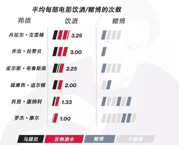 邦德喜爱畅饮美酒,尤其爱喝伏特加马提尼,这已经不是什么秘密。在007系列电影中,邦德本人或其他角色总共为他点了 16次 马提尼,包括《幽灵党》中的两次(尽管只有一次送到)。只有布鲁斯南饰演的邦德平均每部电影喝过 一次以上的马提尼。在每部电影中喝酒次数 最多 的是克雷格饰演的邦德。