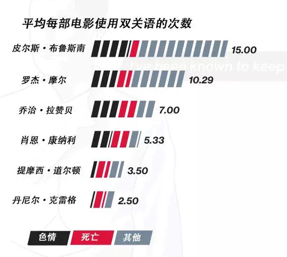 邦德往往爱讲俏皮话,他最经典的笑话就是双关语。彭博的分析发现,邦德在整个007系列电影中讲过 188次 类似的笑话,包括几个重复的段子。根据我们的统计,布鲁斯南饰演的邦德最爱开玩笑,他平均在每部电影中使用 15次 双关语,包括 4个 色情笑话和 1个 死亡笑话。克雷格塑造的邦德更为严肃,很少用双关语调侃。