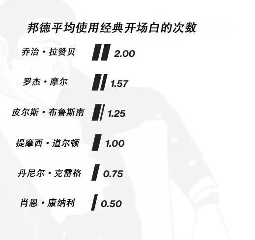 要想断定哪位演员最有邦德的风范,最好的办法就是看看这位间谍在电影中说了几次经典开场白。总体而言,在 24部 电影中,邦德有 26次 说了这句最有代表性的台词。康纳利可能是第一个用姓氏介绍自己的邦德,可是他说这句经典开场白的次数最少。在出演的 6部 007电影中,他只说了 3次。第二任饰演邦德的拉赞贝在他唯一出演的007电影中说了 两次。