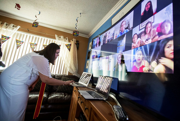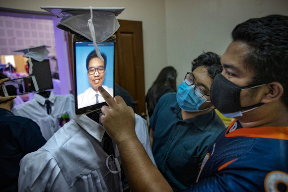学校绞尽脑汁,想要在保持社交距离的基础上,给毕业生们一个难忘的典礼,比如让学生们坐在车里,环绕赛道完成这个重要的仪式。或者,即使毕业典礼的舞台空空荡荡,一台平板电脑和一个机器人可以让毕业生们有机会“出镜”。不少学校干脆在网络上举办一场虚拟的毕业仪式。不过,无论采用何种方式,这都会是让所有毕业生难忘的一次告别。疫情也许改变了毕业的方式,但照片里的面孔仍难掩毕业时的心情。