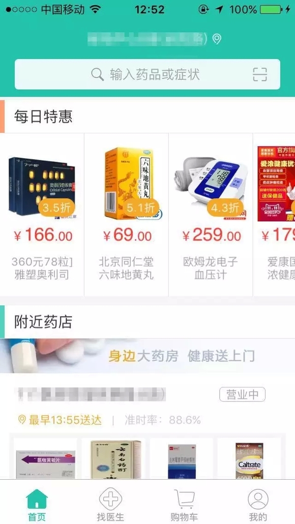 阿里健康APP首页由“每日特惠”、“附近药店”和“热门类目”三个版块组成,用户既可以获得最新的优惠信息,也能查询身边药店的库存情况,有针对性地选购药品。此外,用户还可以在app上方搜索栏输入药品或症状找到合适的药品。