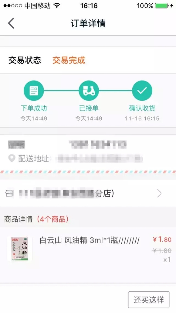 北京市朝阳区望京地区的周女士第一次通过阿里健康APP以O2O的方式购买药品,她在下午2点50分左右向附近药店下单,花费25.2元购买了风油精、曼秀雷敦市复方薄荷脑软膏、金嗓子喉宝、创口贴等四种药品,系统显示本订单免运费。下单后不到1个半小时,快递员就已经将印有阿里健康新logo的环保包装药品送到周女士手中。