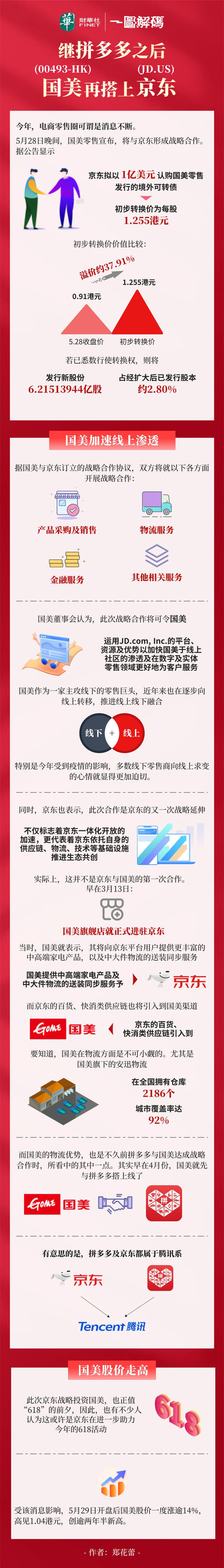 在短短两个月内,国美(00493-HK)就先后获得国内两大电商巨头的战略投资。5月28日晚间,国美宣布,京东拟以1亿美元认购国美发行的境外可转债,初步转换价为每股股份1.255港元,较5月28日收盘价溢价约37.91%。国美表示,与京东的合作符合该集团致力发展将社交电商平台、实体店及国美APP相融合的创新零售模式策略。